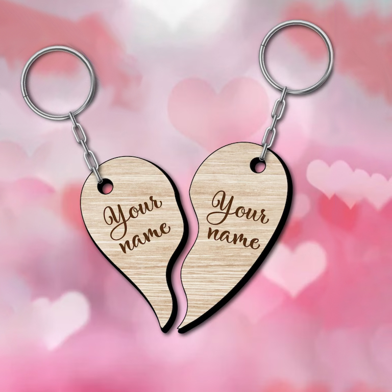 Персонализиран дървен ключодържател, състоящ се от две съвършено допълващи се половини на сърце – символ на любов, връзка и споделеност. Всяка половинка е предназначена за единия човек, а когато се съберат – образуват едно цяло сърце.
