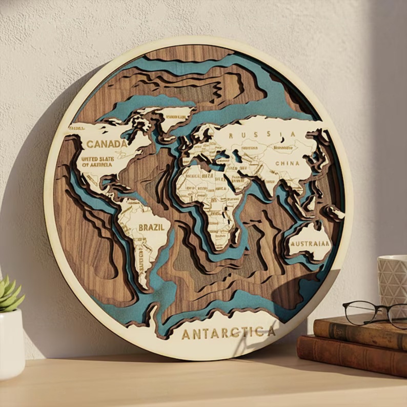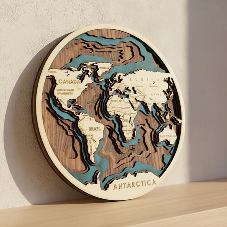 Стилна декоративна карта на света от дърво, изработена от 6 слоя висококачествен шперплат с дебелина 4 мм. Този 3D стенен панел съчетава модерен дизайн и естествена текстура на дървото, което го прави перфектна декорация за дом, офис или студио. Релефните континенти създават дълбочина и впечатляващ визуален ефект, който привлича вниманието във всяко помещение.