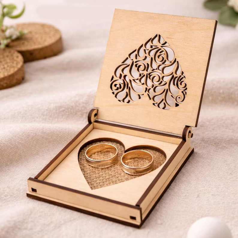Представяме ви елегантна дървена кутийка за халки, създадена с внимание към детайла и изящество. Изработена от фин шперплат с красиво ажурно сърце на капака, тази кутийка е идеалното допълнение към сватбената церемония или подаръчен комплект.