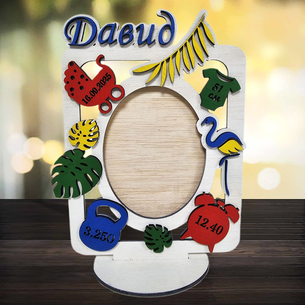 Изработена от висококачествена дървесина и декорирана с пъстри елементи като количка, фламинго, листа и мерителни табелки, рамката съчетава стил и сантименталност. Персонализира се с името на бебето, датата, часа, ръста и теглото при раждане – идеален начин да запазите спомена от този специален ден!