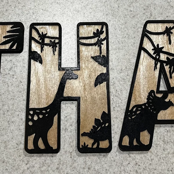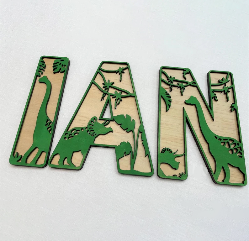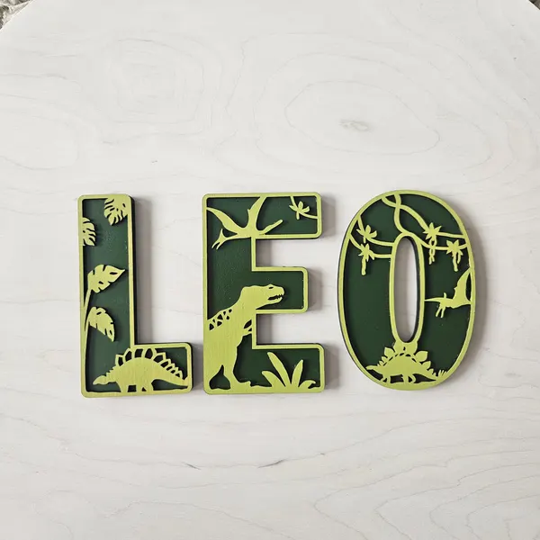 Пренесете се в епохата на динозаврите с нашите декоративни дървени букви с динозаври и джунгла. Всяка буква е изработена от двуслоен брезов шперплат (2 × 4 мм) с обща дебелина 8 мм и височина по избор – от 8 см до 40 см.