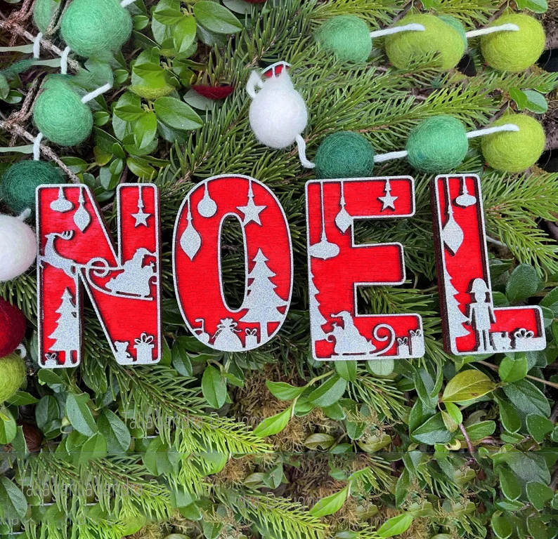 Буквите са украсени с празнични силуети – елхи, снежинки, играчки, подаръци, Дядо Коледа с шейна и други коледни мотиви. Те са идеален акцент за дома, офиса или магазина и могат да бъдат подредени в различни комбинации според вашия повод – например NOEL, XMAS, LOVE, имена или празнични послания.