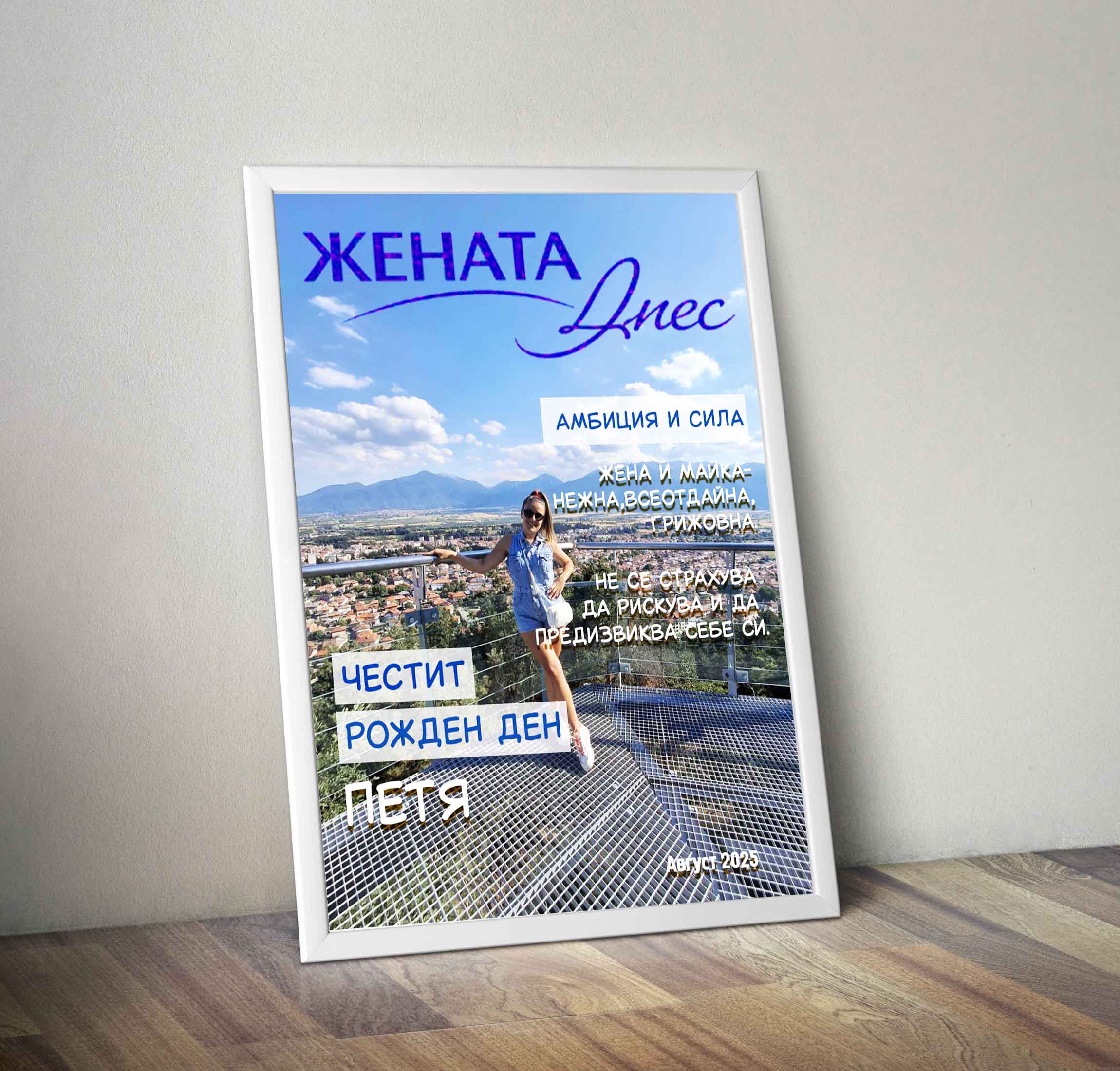 Създайте персонализирана корица на списание с ваша снимка и текст! Нашият екип ще създаде уникален дизайн според вашите предпочитания – изберете заглавие за списанието и добавете специално съобщение или текст, който да отразява вас или ваш близък.