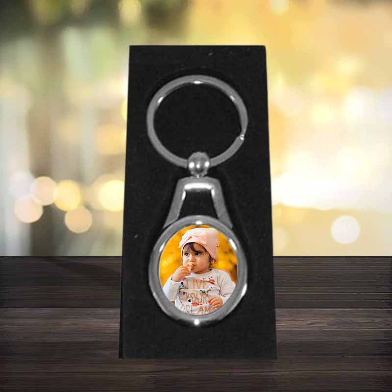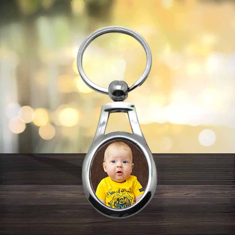 Метален ключодържател с овална форма и плочка за пълноцветен печат, опакован в индивидуална картонена кутия.