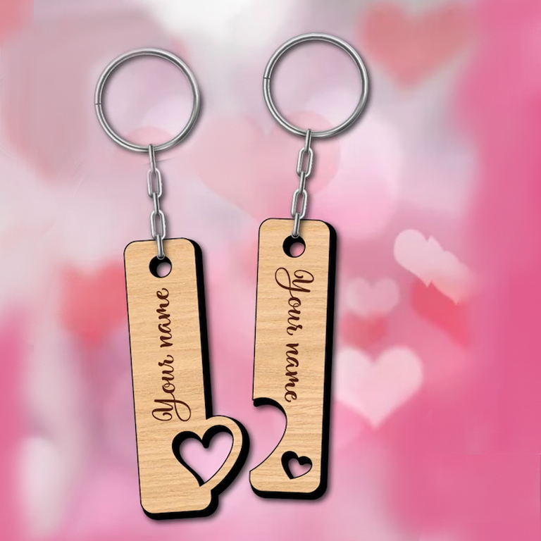 Персонализиран дървен ключодържател за двойки, състоящ се от две отделни, но допълващи се части, които заедно образуват едно цяло сърце. Дизайнът символизира връзката между двама души – близост, любов и принадлежност, дори когато са далеч един от друг.