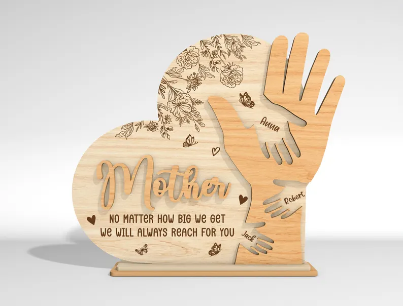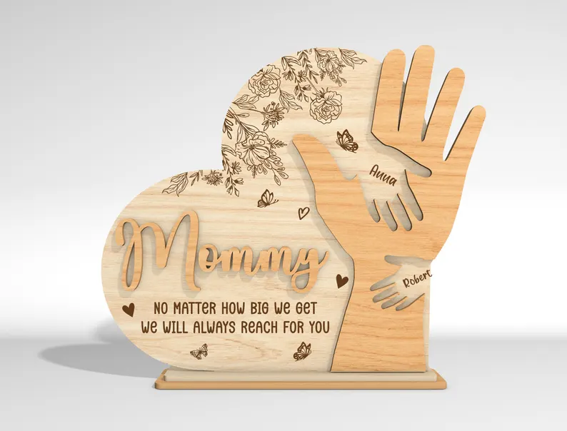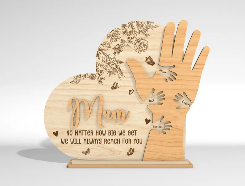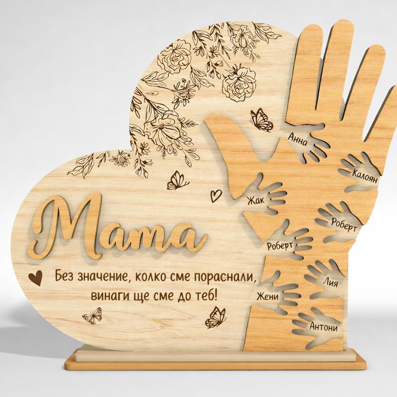 Този емоционален персонализиран дървен сувенир „Мама“ е създаден, за да изрази най-чистата и безусловна любов на децата към своята майка. Дизайнът съчетава елегантна форма на сърце и голяма майчина ръка, в която са вплетени малки детски ръчички – всяка с персонализирано име.