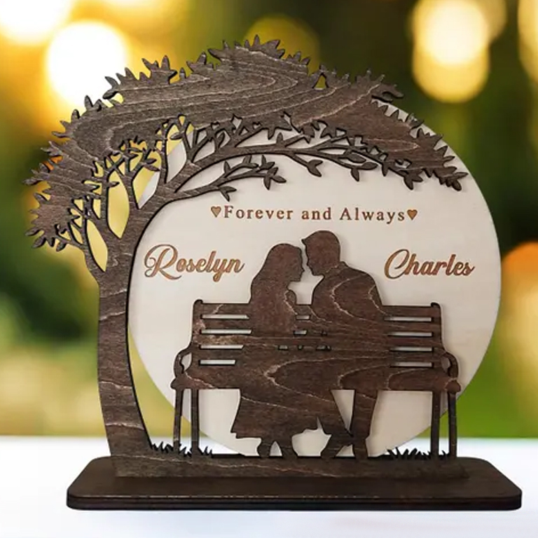 Елегантна персонализирана дървена рамка, изобразяваща влюбена двойка, седяща на пейка под дърво – силен символ на любов, споделени мигове и вечна връзка.