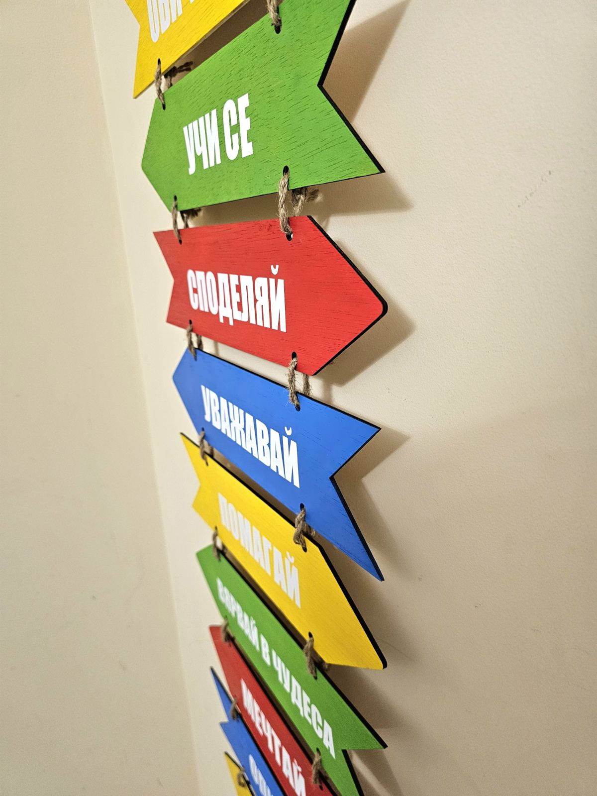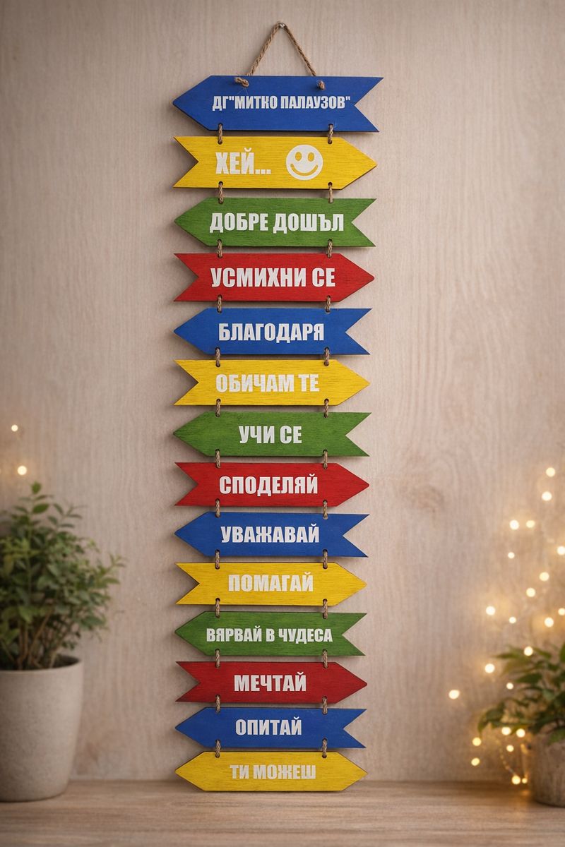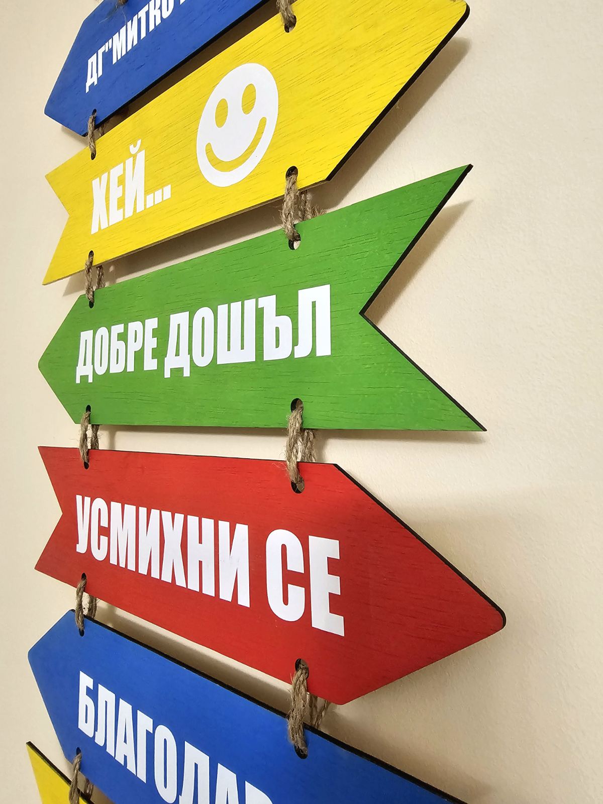 Персонализирана дървена табела с послания – модулна декорация с цветни стрелки
